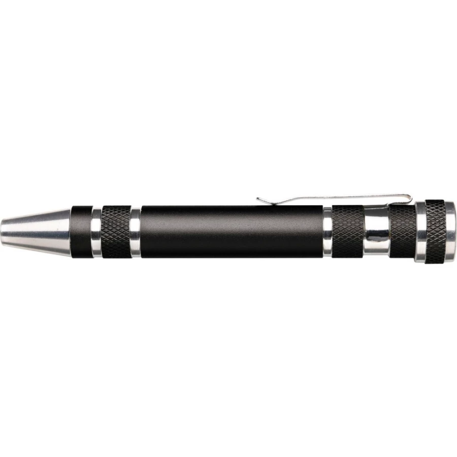 Śrubokręt w kształcie długopisu z 4 płaskimi i 4 krzyżakowymi końcówkami, posiada klip umożliwiający przypinanie, produkt wykonany z aluminium i stali