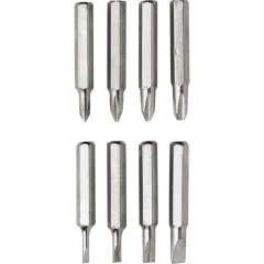 Śrubokręt w kształcie długopisu z 4 płaskimi i 4 krzyżakowymi końcówkami, posiada klip umożliwiający przypinanie, produkt wykonany z aluminium i stali