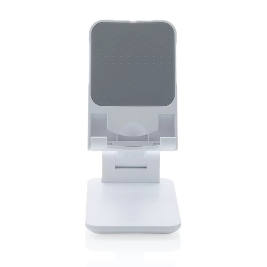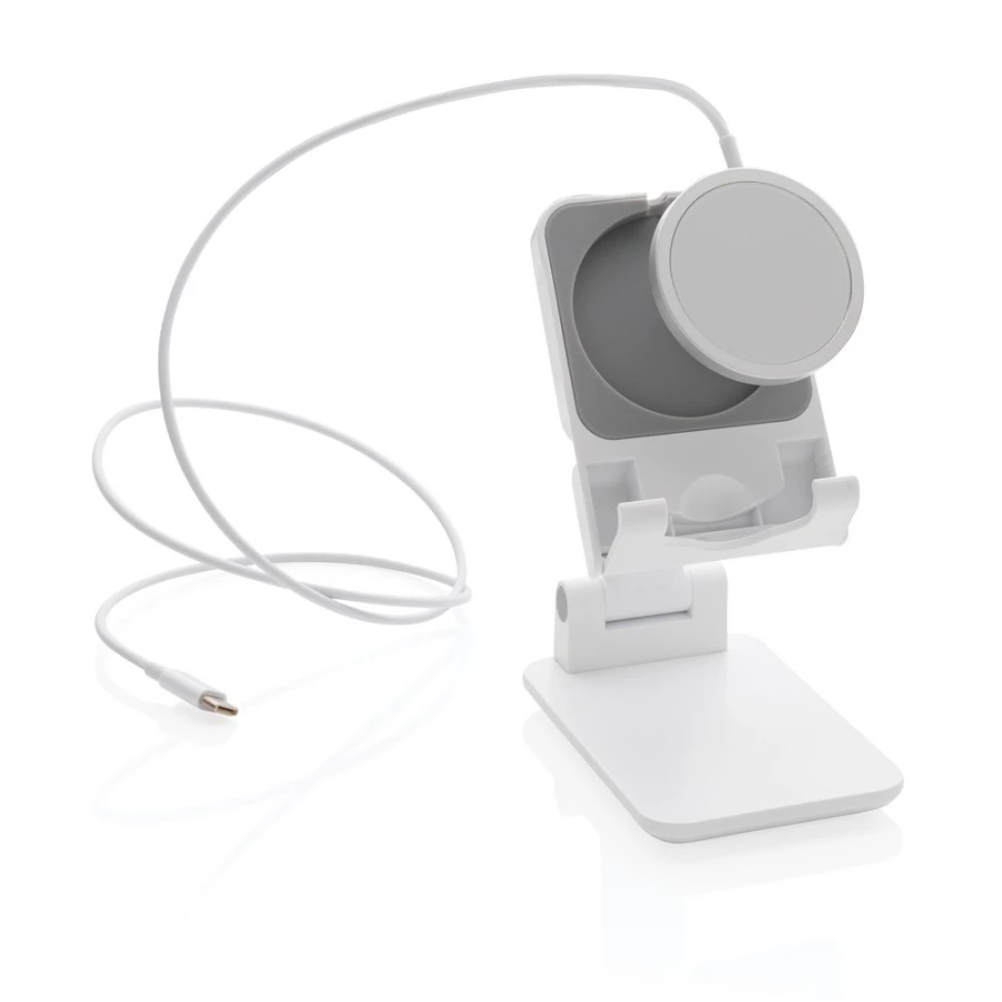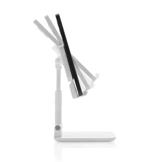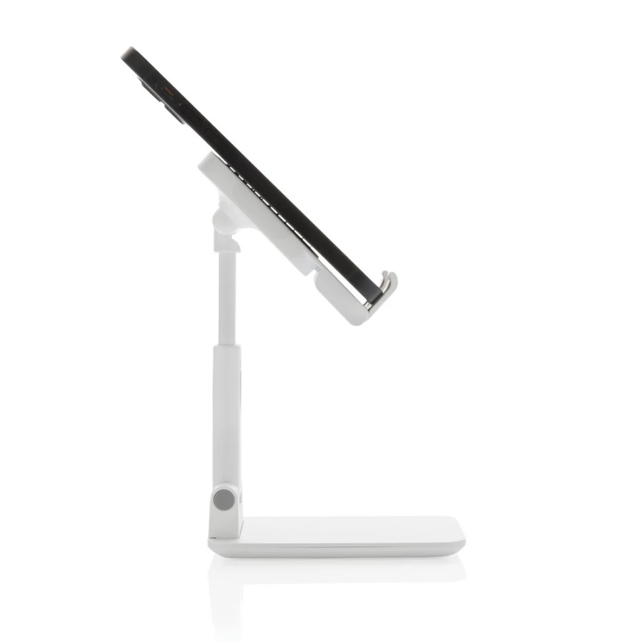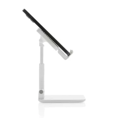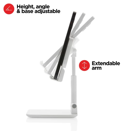 Stojak na telefon, tablet, wykonany z ABS, regulowana wysokość, silikonowy element chroniący przed zarysowaniem w którym można umieścić ładowarkę Magsafe, ciężka podstawa i silikonowe paski zapewniają stabilność, ślad węglowy produktu: 1,03 kg CO2