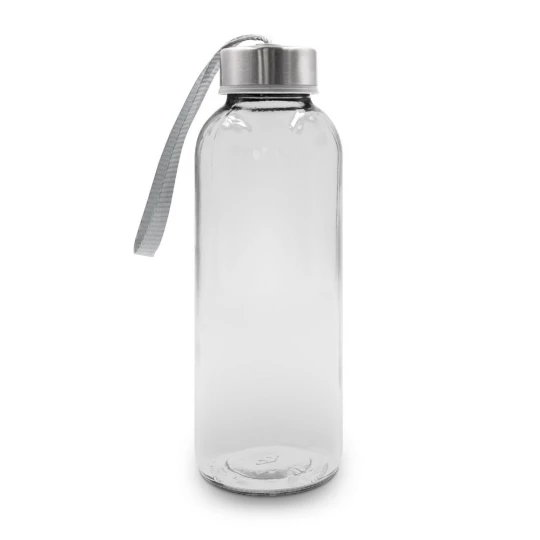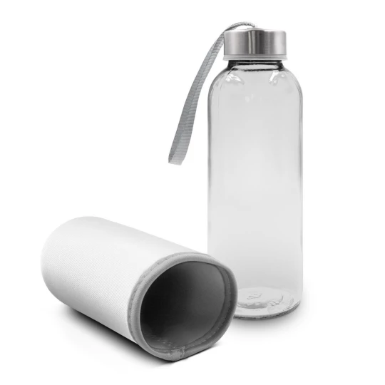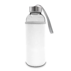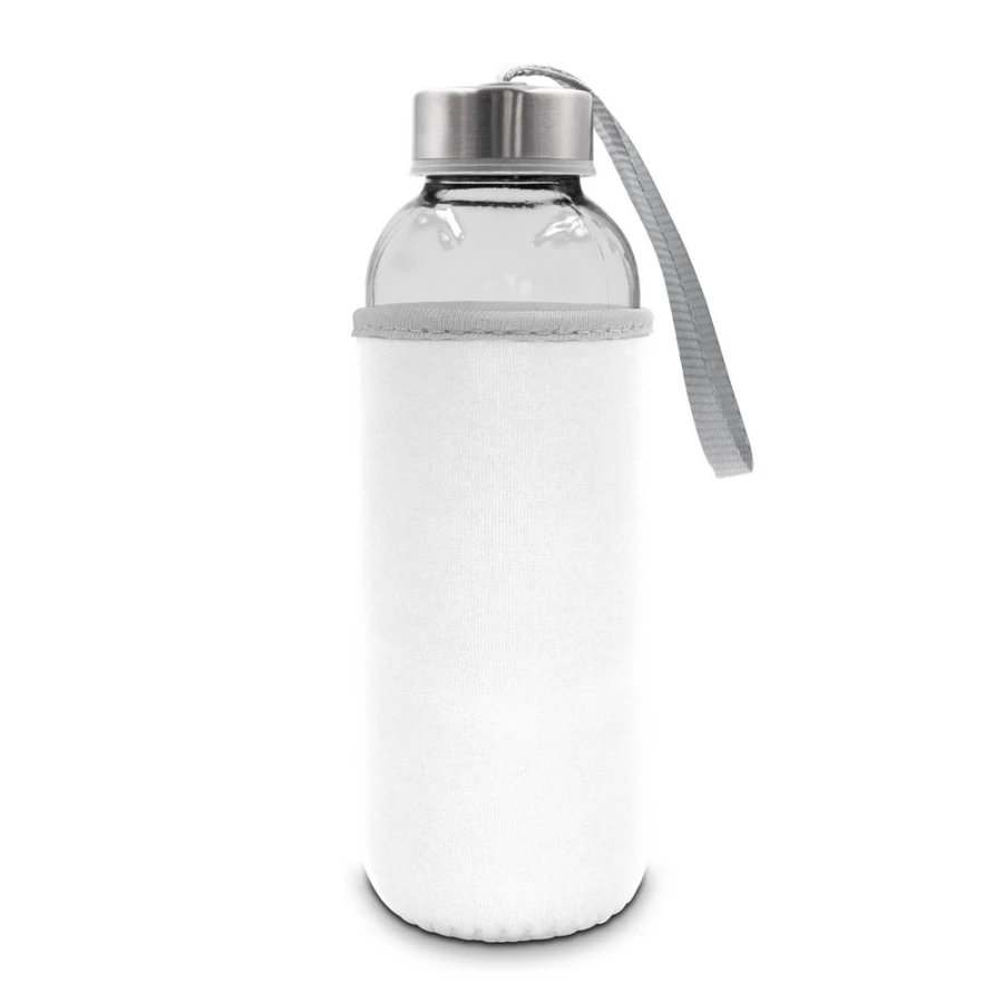 Butelka 420 ml, posiada zakrętkę w srebrnym kolorze oraz uchwyt ułatwiający noszenie, kolorowy pokrowiec w komplecie, produkt wykonany ze szkła i stali nierdzewnej