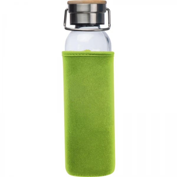 Szklana butelka o pojemności 600 ml, z pokrywką ze stali nierdzewnej i bambusowym zamknięciem. Butelkę przed uszkodzeniami chroni neopropanowe etui.