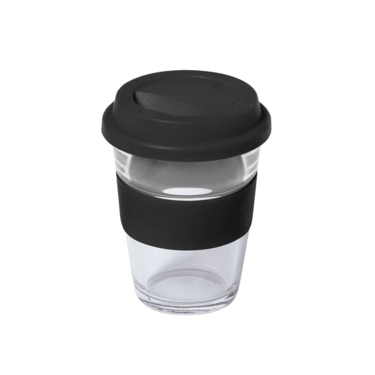 Szklany kubek podróżny 350 ml z kolorową silikonową obręczą i wieczkiem