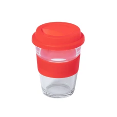 Szklany kubek podróżny 350 ml z kolorową silikonową obręczą i wieczkiem
