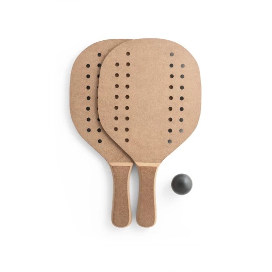 Rakietki plażowe MDF z piłką w zestawie. Dostarczane w bawełnianej torbie. Ponieważ produkt jest wykonany z naturalnych materiałów, kolor produktu oraz wynik drukowania mogą się różnić w zależności od produktu. 330 x 190 x 8 mm