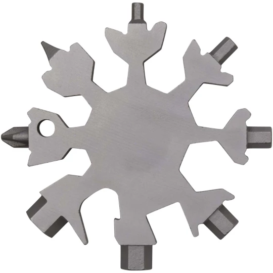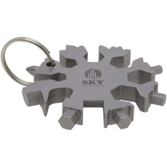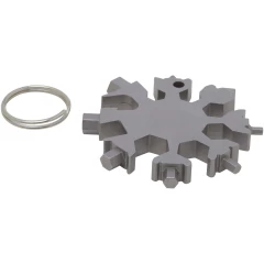 Solidne i kompaktowe 8-funkcyjne narzędzie wielofunkcyjne wykonane ze stali nierdzewnej, które można nosić przy kluczach.