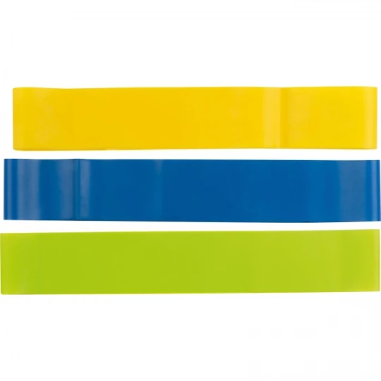 Zestaw 3 różnobarwnych taśm do rozciągania, zapakowanych w przezroczyste plastikowe etui.