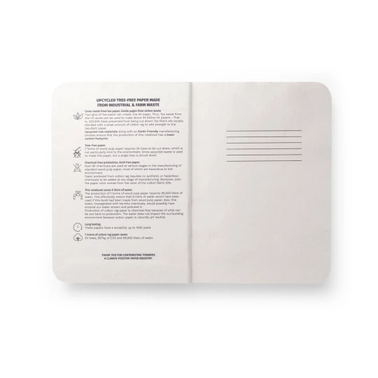 Notatnik A5 z półsztywną okładką wykonaną z odpadów liści herbaty (65%) i odpadów bawełnianych (35%). Papier wewnętrzny wykonany jest z odpadów bawełnianych (100%) i jest bardzo trwały. Zawiera 100 stron w linie oraz papierową opaskę z grafiką. W procesie produkcji tego notatnika nie powstały żadne odpady, nie użyto żadnych chemikaliów ani drzew. Ponieważ produkt jest wykonany z naturalnych materiałów, kolor produktu oraz wynik drukowania mogą się różnić w zależności od produktu. 140 x 200 mm