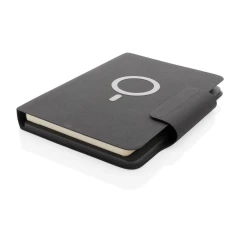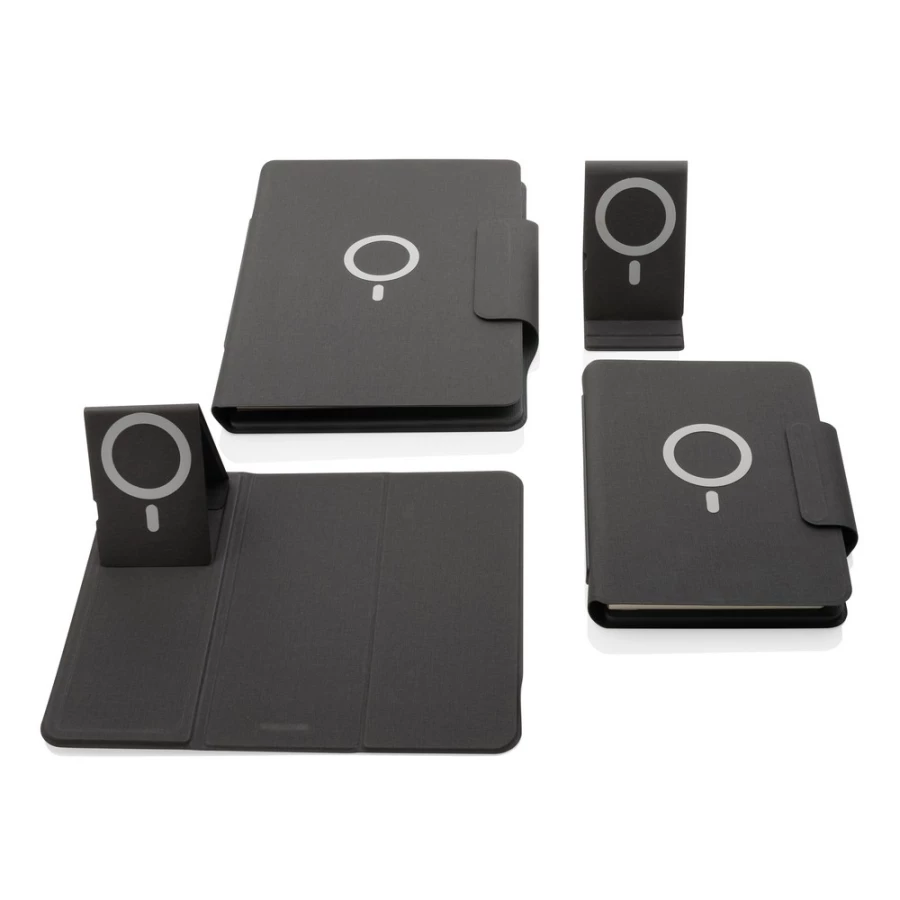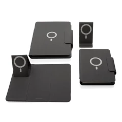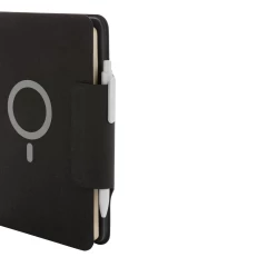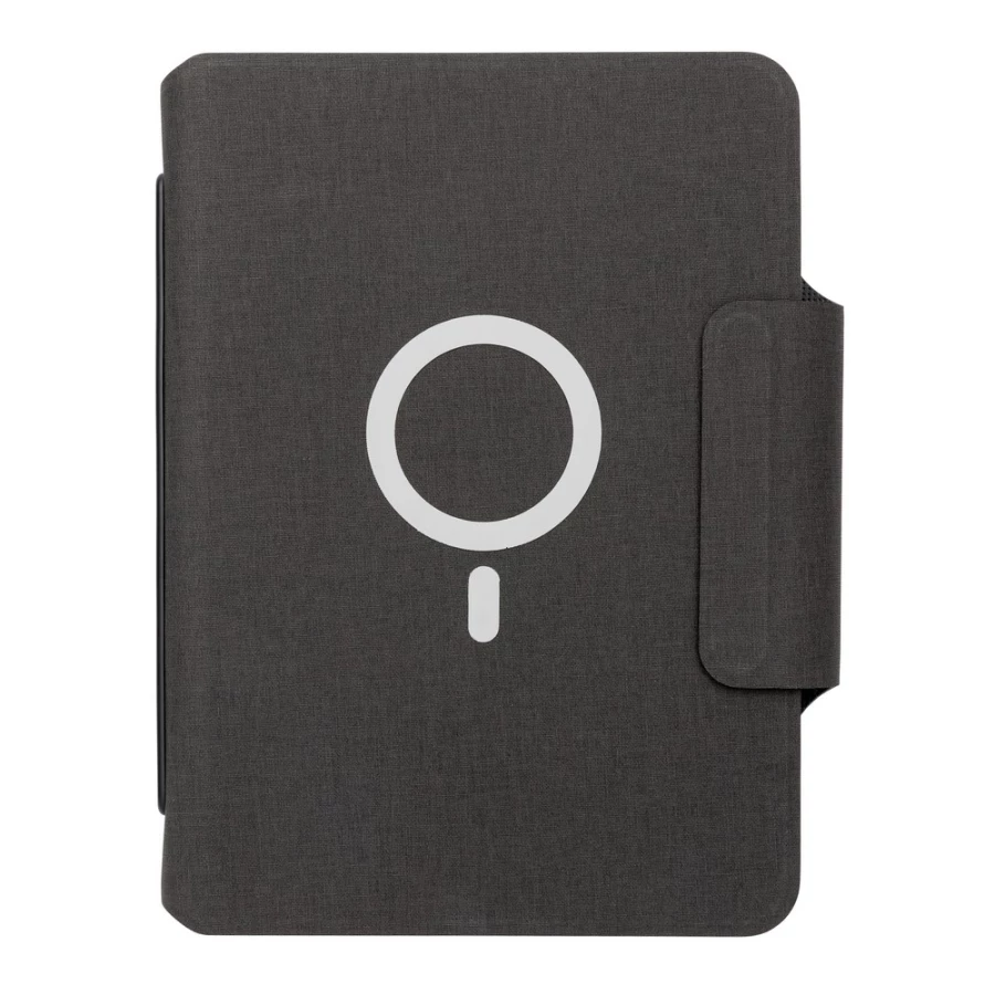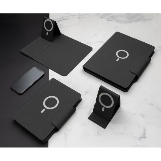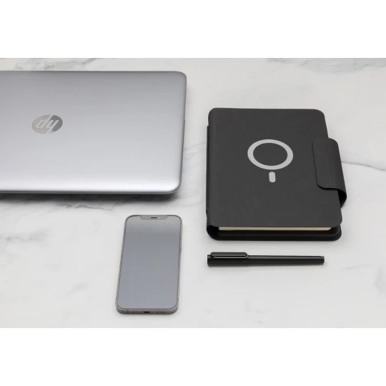 Teczka konferencyjna z notatnikiem A5 (64 kartki 80 g/m2 w linie), bezprzewodowy power bank 8000 mAh, magnetyczna ładowarka bezprzewodowa 10W, 19 wbudowanych magnesów N52H, posiada port USB do ładowania za pomocą kabla, bezprzewodowe ładowanie jest kompatybilne ze wszystkimi urządzeniami posiadającymi możliwość ładowania indukcyjnego, wejście typu C 9V/2A, wyjście typu C 9V/2A, wyjście bezprzewodowe 9V/1.1A, wzór zastrzeżony ®, ślad węglowy produktu: 5,16 kg CO2