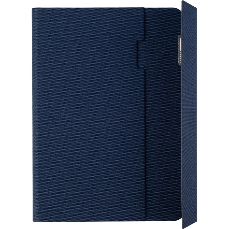 Teczka konferencyjna w formacie ok. A5, zawiera notatnik posiada 64 kartki w linie, przegródki na dokumenty, uchwyt na telefon, zamknięcie magnetyczne, pakowany pojedynczo w kraftowy rękaw, produkt wykonany z RPET