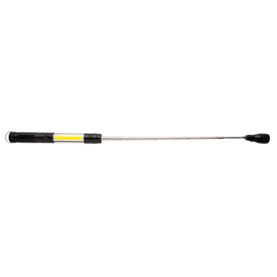Teleskopowa latarka COB, obudowa wykonana z aluminium, elastyczna, wysuwana końcówka wyposażona jest w 3 diody LED oraz magnes do wyciągania przedmiotów z trudno dostępnych miejsc, z boku jasne światło COB 80 lumenów, baterie w komplecie, ślad węglowy produktu: 2,73 kg CO2