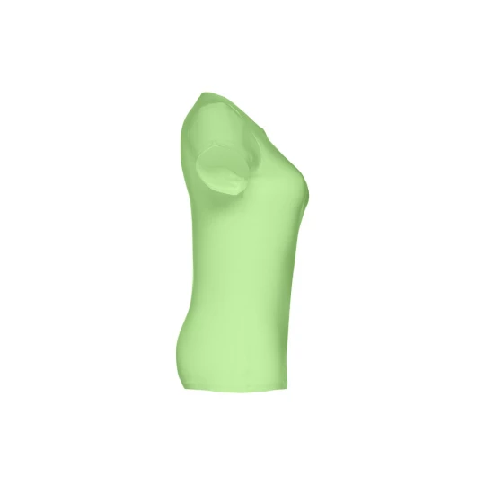 Damski t-shirt o dopasowanym kroju. 100% bawełna dżersej (190 g/m²) ze zgrzebną przędzą bawełnianą (kolor 183: 90% bawełna/10% wiskoza). Posiada cienki kołnierzyk z dżerseju wzmocniony satynową tasiemką. Zszywany po bokach, z podwójnym ściegiem na rękawach i na dole. Rozmiary: S, M, L, XL, XXL