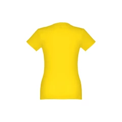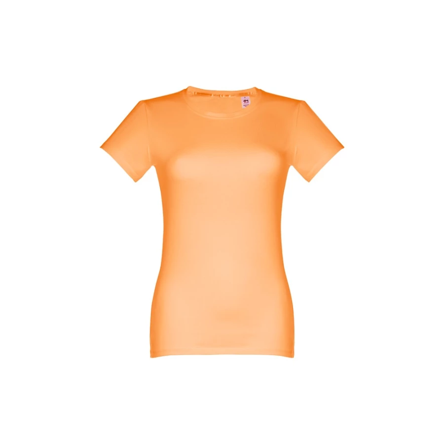 Damski t-shirt o dopasowanym kroju. 100% bawełna dżersej (190 g/m²) ze zgrzebną przędzą bawełnianą (kolor 183: 90% bawełna/10% wiskoza). Posiada cienki kołnierzyk z dżerseju wzmocniony satynową tasiemką. Zszywany po bokach, z podwójnym ściegiem na rękawach i na dole. Rozmiary: S, M, L, XL, XXL