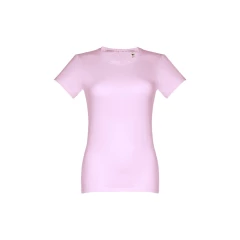 Damski t-shirt o dopasowanym kroju. 100% bawełna dżersej (190 g/m²) ze zgrzebną przędzą bawełnianą (kolor 183: 90% bawełna/10% wiskoza). Posiada cienki kołnierzyk z dżerseju wzmocniony satynową tasiemką. Zszywany po bokach, z podwójnym ściegiem na rękawach i na dole. Rozmiary: S, M, L, XL, XXL