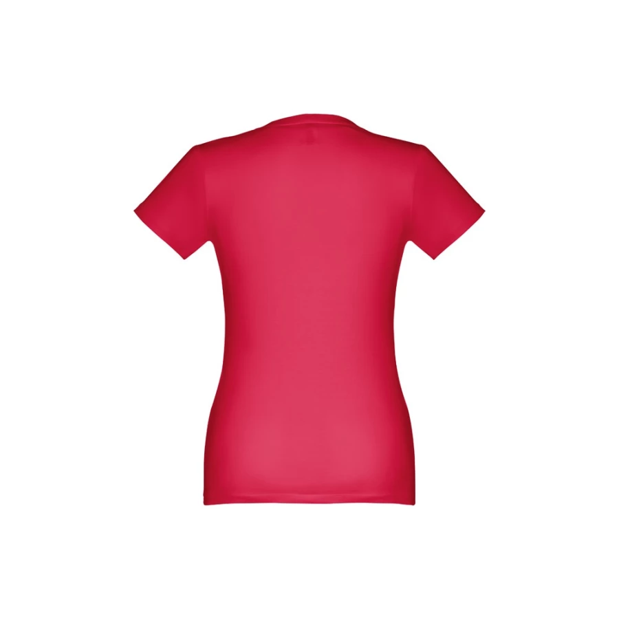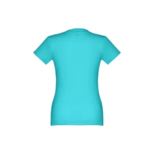 Damski t-shirt o dopasowanym kroju. 100% bawełna dżersej (190 g/m²) ze zgrzebną przędzą bawełnianą (kolor 183: 90% bawełna/10% wiskoza). Posiada cienki kołnierzyk z dżerseju wzmocniony satynową tasiemką. Zszywany po bokach, z podwójnym ściegiem na rękawach i na dole. Rozmiary: S, M, L, XL, XXL