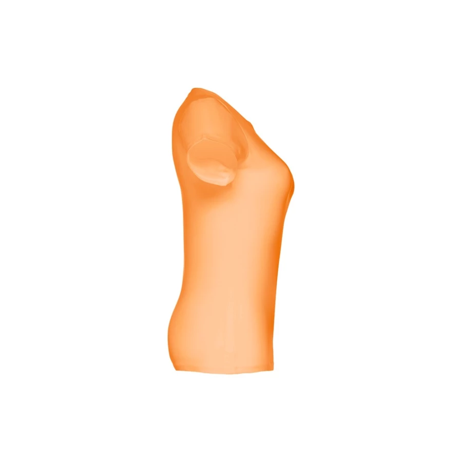 Damski t-shirt o dopasowanym kroju. 100% bawełna dżersej (190 g/m²) ze zgrzebną przędzą bawełnianą (kolor 183: 90% bawełna/10% wiskoza). Posiada cienki kołnierzyk z dżerseju wzmocniony satynową tasiemką. Zszywany po bokach, z podwójnym ściegiem na rękawach i na dole. Rozmiary: S, M, L, XL, XXL
