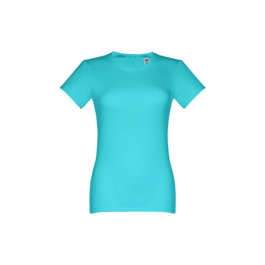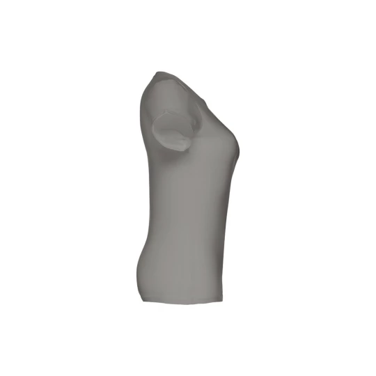 Damski t-shirt o dopasowanym kroju. 100% bawełna dżersej (190 g/m²) ze zgrzebną przędzą bawełnianą (kolor 183: 90% bawełna/10% wiskoza). Posiada cienki kołnierzyk z dżerseju wzmocniony satynową tasiemką. Zszywany po bokach, z podwójnym ściegiem na rękawach i na dole. Rozmiary: S, M, L, XL, XXL
