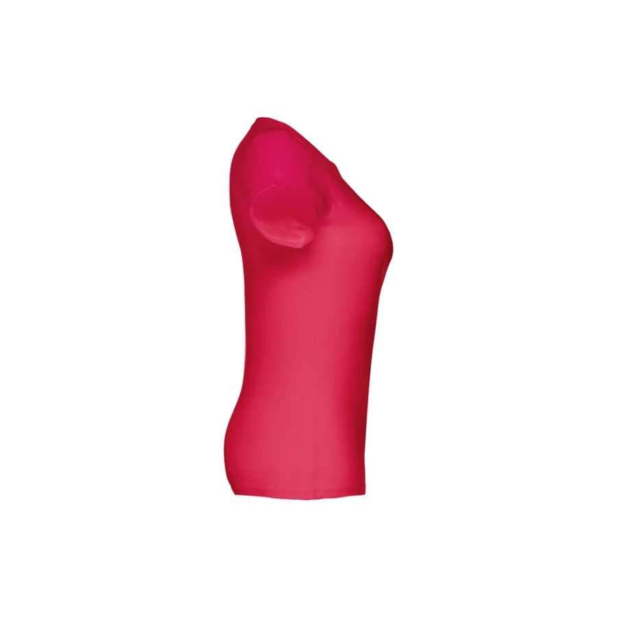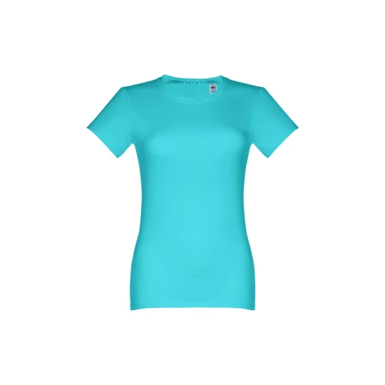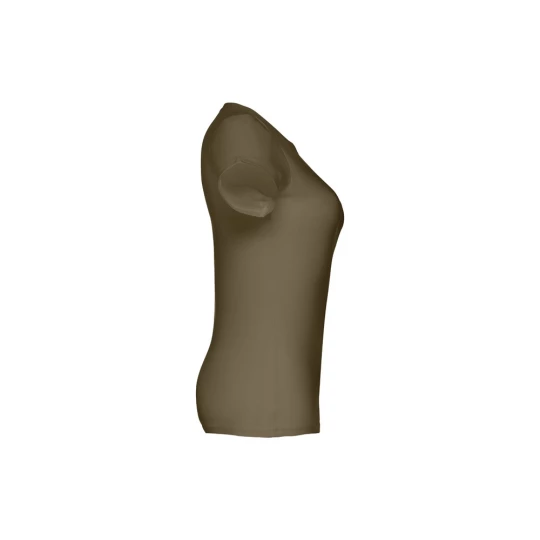 Damski t-shirt o dopasowanym kroju. 100% bawełna dżersej (190 g/m²) ze zgrzebną przędzą bawełnianą (kolor 183: 90% bawełna/10% wiskoza). Posiada cienki kołnierzyk z dżerseju wzmocniony satynową tasiemką. Zszywany po bokach, z podwójnym ściegiem na rękawach i na dole. Rozmiary: S, M, L, XL, XXL