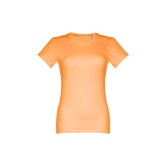 Damski t-shirt o dopasowanym kroju. 100% bawełna dżersej (190 g/m²) ze zgrzebną przędzą bawełnianą (kolor 183: 90% bawełna/10% wiskoza). Posiada cienki kołnierzyk z dżerseju wzmocniony satynową tasiemką. Zszywany po bokach, z podwójnym ściegiem na rękawach i na dole. Rozmiary: S, M, L, XL, XXL