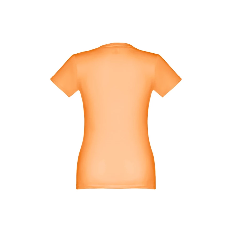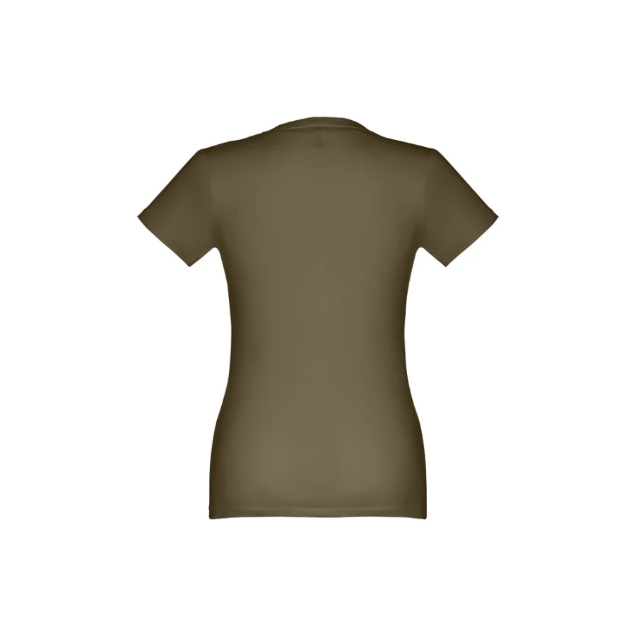 Damski t-shirt o dopasowanym kroju. 100% bawełna dżersej (190 g/m²) ze zgrzebną przędzą bawełnianą (kolor 183: 90% bawełna/10% wiskoza). Posiada cienki kołnierzyk z dżerseju wzmocniony satynową tasiemką. Zszywany po bokach, z podwójnym ściegiem na rękawach i na dole. Rozmiary: S, M, L, XL, XXL