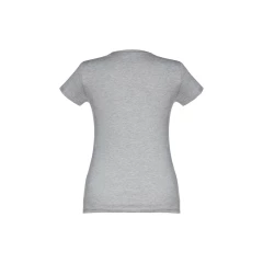 Damski t-shirt o dopasowanym kroju. 100% bawełna dżersej (190 g/m²) ze zgrzebną przędzą bawełnianą (kolor 183: 90% bawełna/10% wiskoza). Posiada cienki kołnierzyk z dżerseju wzmocniony satynową tasiemką. Zszywany po bokach, z podwójnym ściegiem na rękawach i na dole. Rozmiary: S, M, L, XL, XXL