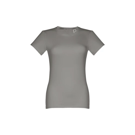 Damski t-shirt o dopasowanym kroju. 100% bawełna dżersej (190 g/m²) ze zgrzebną przędzą bawełnianą (kolor 183: 90% bawełna/10% wiskoza). Posiada cienki kołnierzyk z dżerseju wzmocniony satynową tasiemką. Zszywany po bokach, z podwójnym ściegiem na rękawach i na dole. Rozmiary: S, M, L, XL, XXL