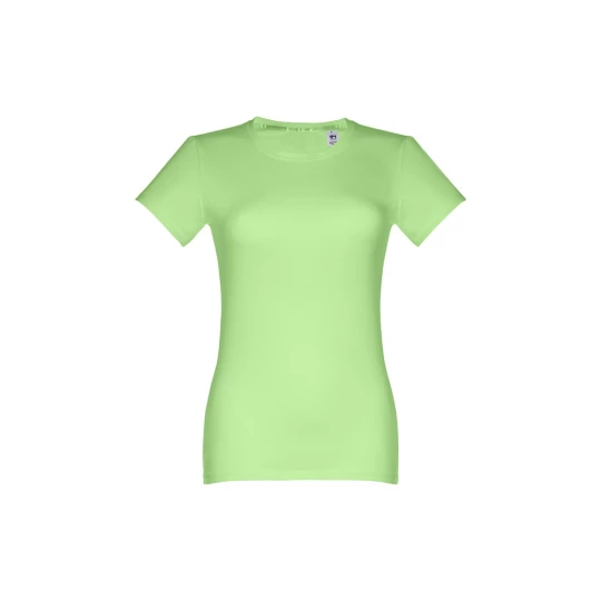 Damski t-shirt o dopasowanym kroju. 100% bawełna dżersej (190 g/m²) ze zgrzebną przędzą bawełnianą (kolor 183: 90% bawełna/10% wiskoza). Posiada cienki kołnierzyk z dżerseju wzmocniony satynową tasiemką. Zszywany po bokach, z podwójnym ściegiem na rękawach i na dole. Rozmiary: S, M, L, XL, XXL