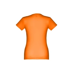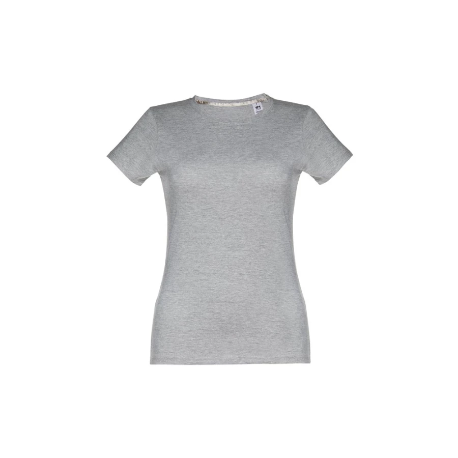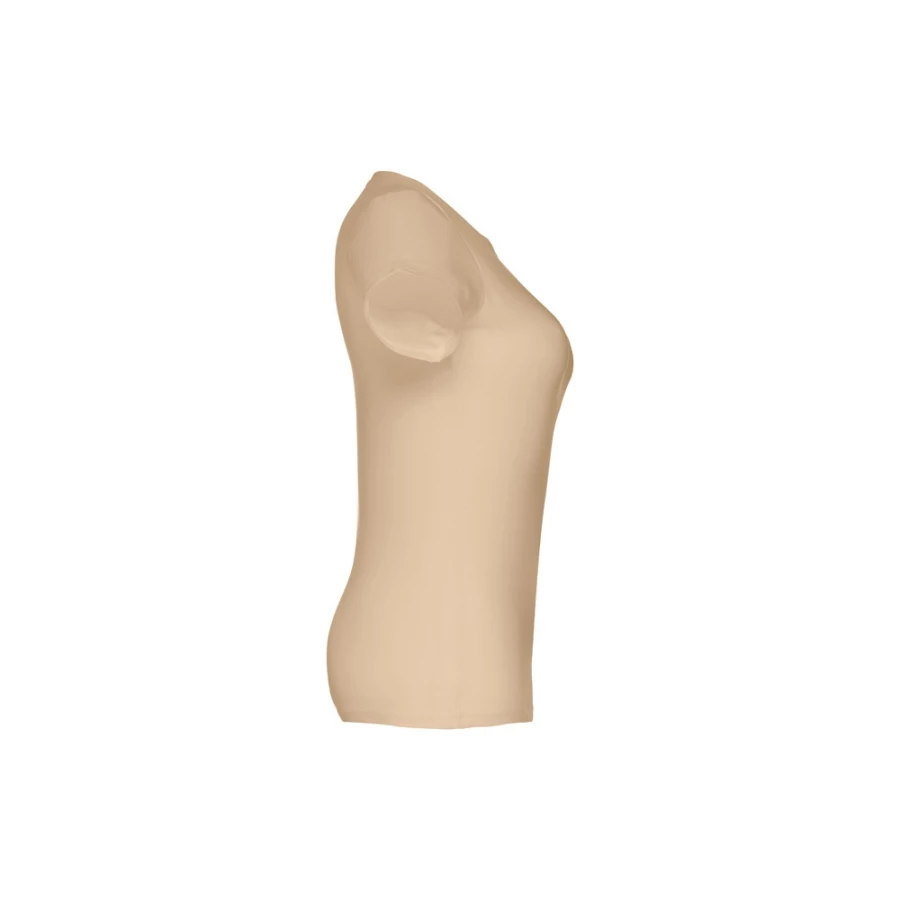 Damski t-shirt o dopasowanym kroju. 100% bawełna dżersej (190 g/m²) ze zgrzebną przędzą bawełnianą (kolor 183: 90% bawełna/10% wiskoza). Posiada cienki kołnierzyk z dżerseju wzmocniony satynową tasiemką. Zszywany po bokach, z podwójnym ściegiem na rękawach i na dole. Rozmiary: S, M, L, XL, XXL