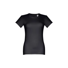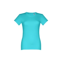 Damski t-shirt o dopasowanym kroju. 100% bawełna dżersej (190 g/m²) ze zgrzebną przędzą bawełnianą (kolor 183: 90% bawełna/10% wiskoza). Posiada cienki kołnierzyk z dżerseju wzmocniony satynową tasiemką. Zszywany po bokach, z podwójnym ściegiem na rękawach i na dole. Rozmiary: S, M, L, XL, XXL