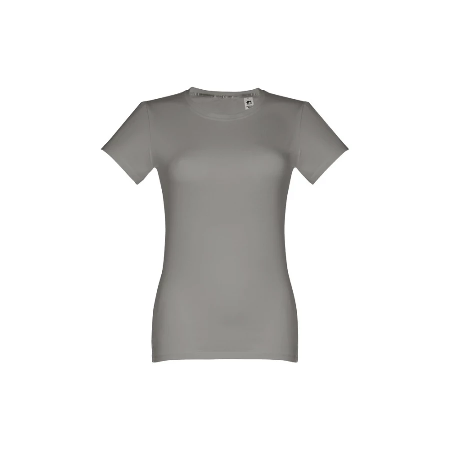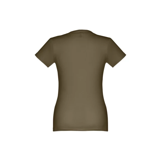 Damski t-shirt o dopasowanym kroju. 100% bawełna dżersej (190 g/m²) ze zgrzebną przędzą bawełnianą (kolor 183: 90% bawełna/10% wiskoza). Posiada cienki kołnierzyk z dżerseju wzmocniony satynową tasiemką. Zszywany po bokach, z podwójnym ściegiem na rękawach i na dole. Rozmiary: S, M, L, XL, XXL
