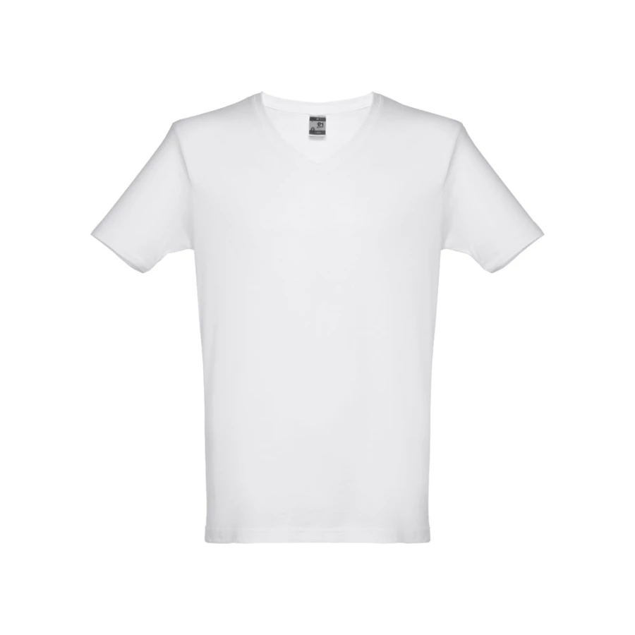 Męski t-shirt o regularnym kroju. 100% bawełna dżersej (150 g/m²) ze zgrzebną przędzą bawełnianą. Posiada kołnierzyk z dżerseju ze wzmocnionym dekoltem w kształcie litery „V”, wewnątrz z dżersejową tasiemką. Podwójne szwy na rękawach i dolnej części. Rozmiary: S, M, L, XL, XXL