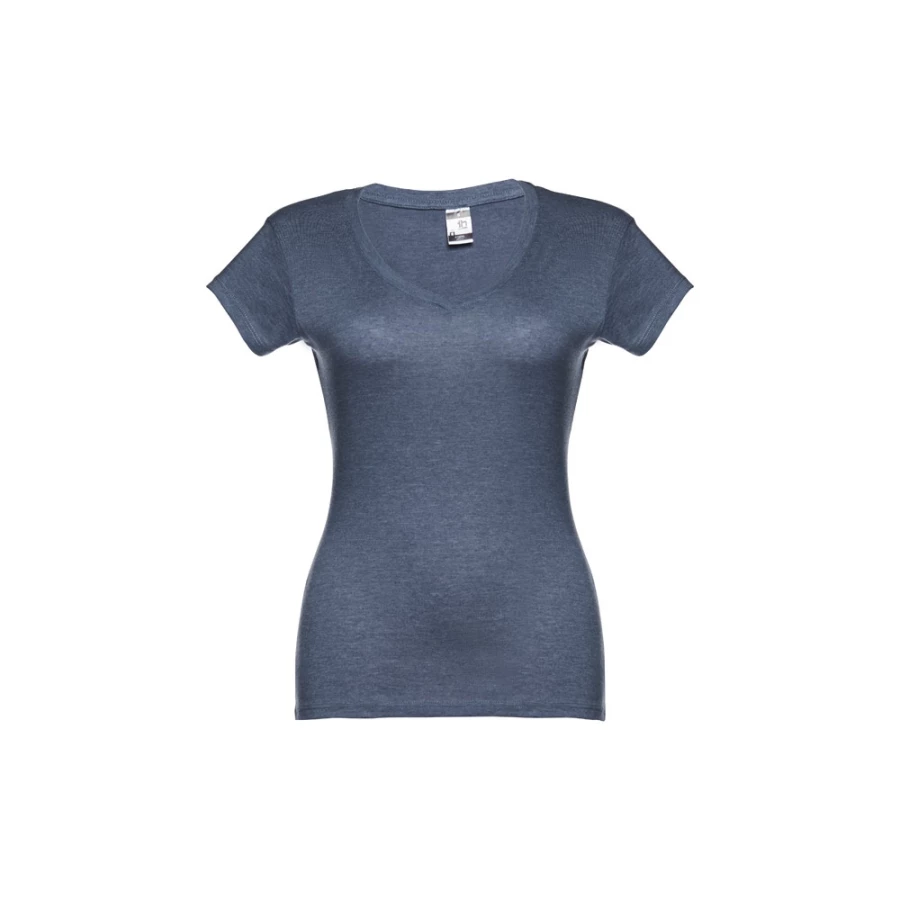 Damski t-shirt o dopasowanym kroju. 100% bawełna dżersej (150 g/m²) ze zgrzebną przędzą bawełnianą (kolory: 194, 195 i 199: 60% bawełna/40% poliester). Posiada kołnierzyk z dżerseju z dekoltem w kształcie litery „V”, wzmocniony od wewnątrz dżersejową tasiemką. Podwójne szwy na rękawach i dolnej części. Rozmiary: S, M, L, XL, XXL