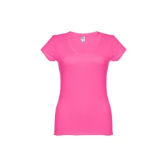 Damski t-shirt o dopasowanym kroju. 100% bawełna dżersej (150 g/m²) ze zgrzebną przędzą bawełnianą (kolory: 194, 195 i 199: 60% bawełna/40% poliester). Posiada kołnierzyk z dżerseju z dekoltem w kształcie litery „V”, wzmocniony od wewnątrz dżersejową tasiemką. Podwójne szwy na rękawach i dolnej części. Rozmiary: S, M, L, XL, XXL