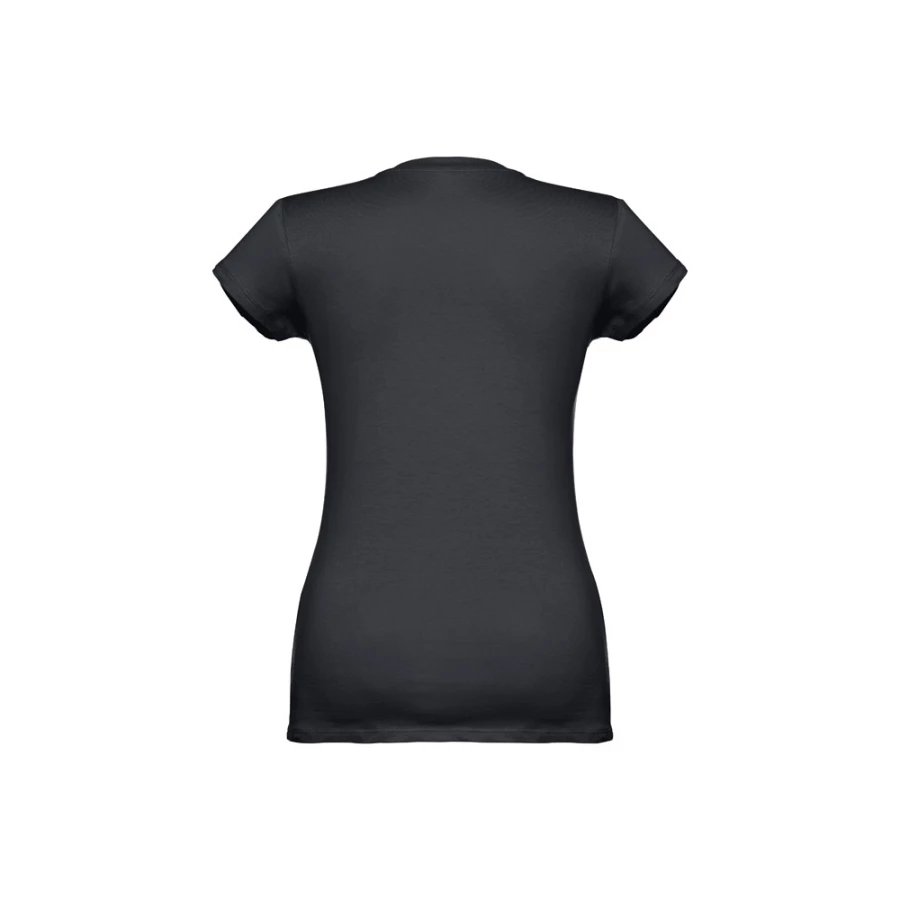 Damski t-shirt o dopasowanym kroju. 100% bawełna dżersej (150 g/m²) ze zgrzebną przędzą bawełnianą (kolory: 194, 195 i 199: 60% bawełna/40% poliester). Posiada kołnierzyk z dżerseju z dekoltem w kształcie litery „V”, wzmocniony od wewnątrz dżersejową tasiemką. Podwójne szwy na rękawach i dolnej części. Rozmiary: S, M, L, XL, XXL