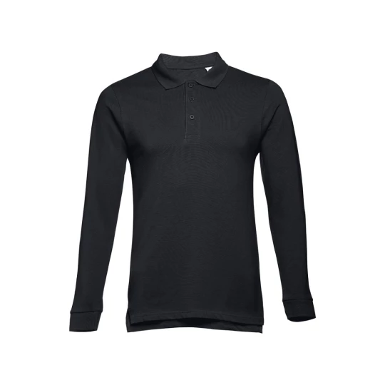 Męski t-shirt polo z długim rękawem ze 100% bawełny o splocie piqué (210 g/m²) ze zgrzebną przędzą bawełnianą (kolor 183: 85% bawełna/15% wiskoza). Polo o regularnym fasonie, z prążkowanym kołnierzykiem i rękawami. Kołnierzyk jest wzmocniony taśmą piqué. Posiada 3 dopasowane kolorystycznie guziki (dodatkowy guzik umieszczony w szwie wewnętrznym). Zszywany po bokach, z małymi rozcięciami w szwach bocznych. Zdejmowana widoczna etykieta. Rozmiary: S, M, L, XL, XXL