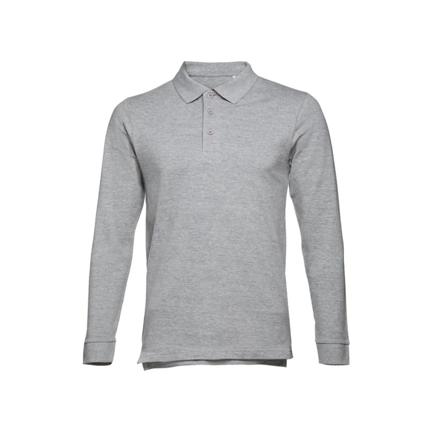 Męski t-shirt polo z długim rękawem ze 100% bawełny o splocie piqué (210 g/m²) ze zgrzebną przędzą bawełnianą (kolor 183: 85% bawełna/15% wiskoza). Polo o regularnym fasonie, z prążkowanym kołnierzykiem i rękawami. Kołnierzyk jest wzmocniony taśmą piqué. Posiada 3 dopasowane kolorystycznie guziki (dodatkowy guzik umieszczony w szwie wewnętrznym). Zszywany po bokach, z małymi rozcięciami w szwach bocznych. Zdejmowana widoczna etykieta. Rozmiary: S, M, L, XL, XXL