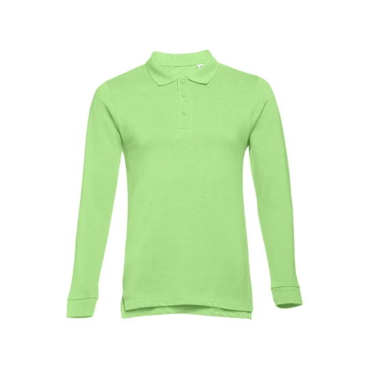 Męski t-shirt polo z długim rękawem ze 100% bawełny o splocie piqué (210 g/m²) ze zgrzebną przędzą bawełnianą (kolor 183: 85% bawełna/15% wiskoza). Polo o regularnym fasonie, z prążkowanym kołnierzykiem i rękawami. Kołnierzyk jest wzmocniony taśmą piqué. Posiada 3 dopasowane kolorystycznie guziki (dodatkowy guzik umieszczony w szwie wewnętrznym). Zszywany po bokach, z małymi rozcięciami w szwach bocznych. Zdejmowana widoczna etykieta. Rozmiary: S, M, L, XL, XXL