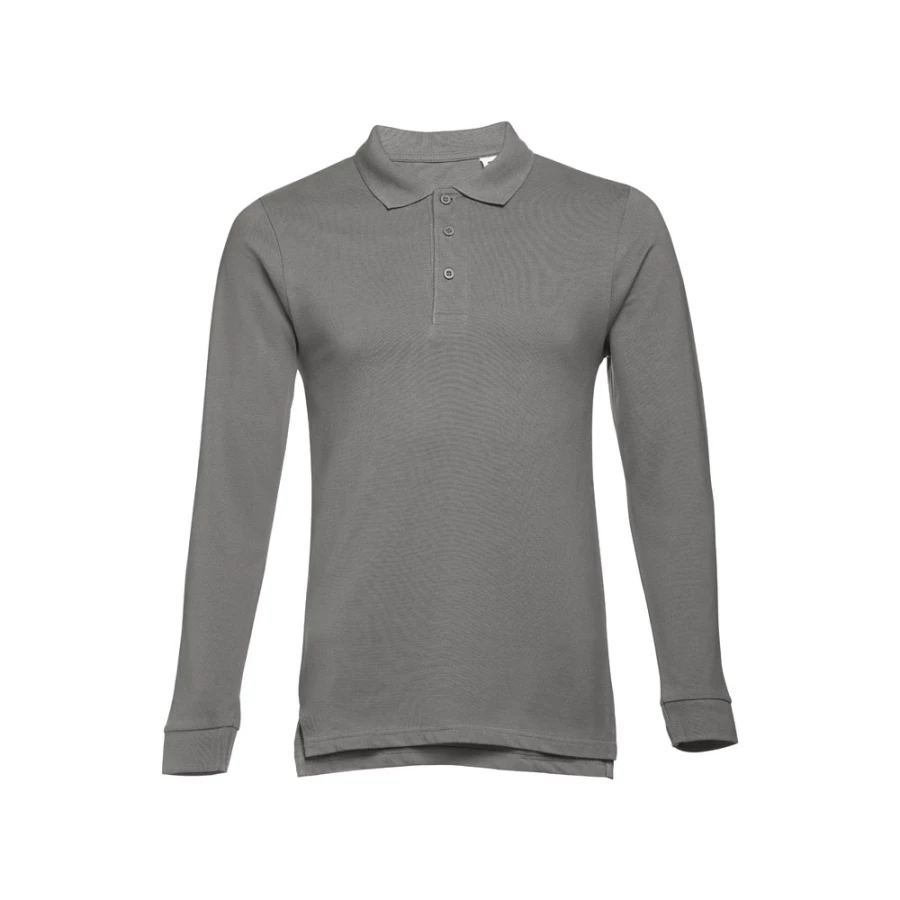 Męski t-shirt polo z długim rękawem ze 100% bawełny o splocie piqué (210 g/m²) ze zgrzebną przędzą bawełnianą (kolor 183: 85% bawełna/15% wiskoza). Polo o regularnym fasonie, z prążkowanym kołnierzykiem i rękawami. Kołnierzyk jest wzmocniony taśmą piqué. Posiada 3 dopasowane kolorystycznie guziki (dodatkowy guzik umieszczony w szwie wewnętrznym). Zszywany po bokach, z małymi rozcięciami w szwach bocznych. Zdejmowana widoczna etykieta. Rozmiary: S, M, L, XL, XXL