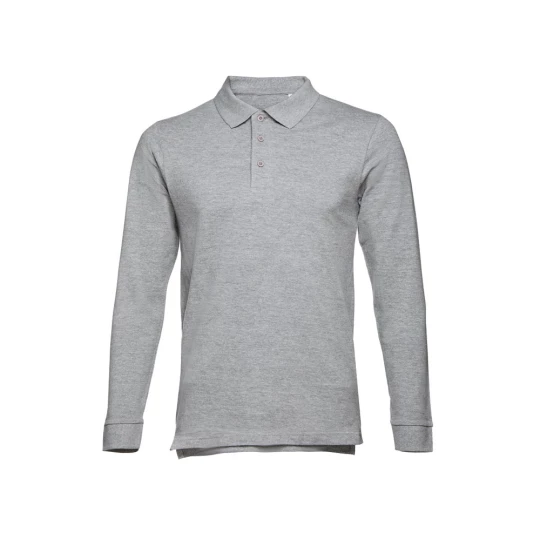 Męski t-shirt polo z długim rękawem ze 100% bawełny o splocie piqué (210 g/m²) ze zgrzebną przędzą bawełnianą (kolor 183: 85% bawełna/15% wiskoza). Polo o regularnym fasonie, z prążkowanym kołnierzykiem i rękawami. Kołnierzyk jest wzmocniony taśmą piqué. Posiada 3 dopasowane kolorystycznie guziki (dodatkowy guzik umieszczony w szwie wewnętrznym). Zszywany po bokach, z małymi rozcięciami w szwach bocznych. Zdejmowana widoczna etykieta. Rozmiary: S, M, L, XL, XXL