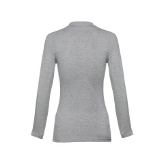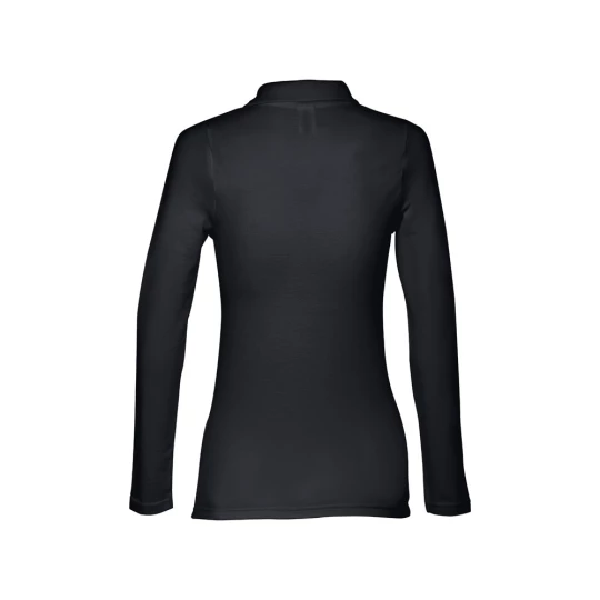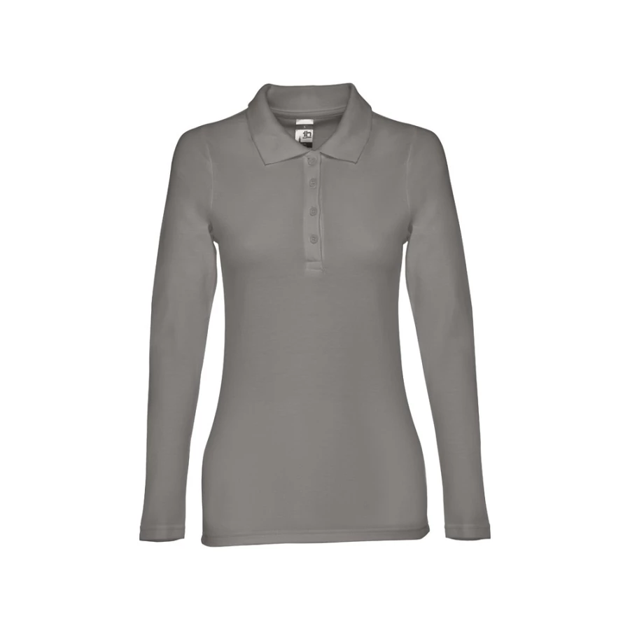 Damski t-shirt polo z długim rękawem ze 100% bawełny o splocie piqué (210 g/m²) ze zgrzebną przędzą bawełnianą (kolor 183: 85% bawełna/15% wiskoza). Prążkowany kołnierzyk jest wzmocniony taśmą piqué. Posiada 4 dopasowane kolorystycznie guziki (dodatkowy guzik umieszczony w szwie wewnętrznym). Zszywany po bokach, z podwójnym ściegiem na rękawach. Zdejmowana widoczna etykieta. Rozmiary: S, M, L, XL, XXL