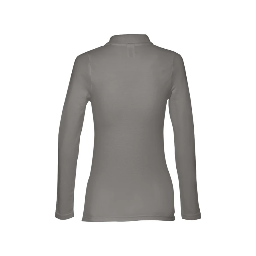 Damski t-shirt polo z długim rękawem ze 100% bawełny o splocie piqué (210 g/m²) ze zgrzebną przędzą bawełnianą (kolor 183: 85% bawełna/15% wiskoza). Prążkowany kołnierzyk jest wzmocniony taśmą piqué. Posiada 4 dopasowane kolorystycznie guziki (dodatkowy guzik umieszczony w szwie wewnętrznym). Zszywany po bokach, z podwójnym ściegiem na rękawach. Zdejmowana widoczna etykieta. Rozmiary: S, M, L, XL, XXL