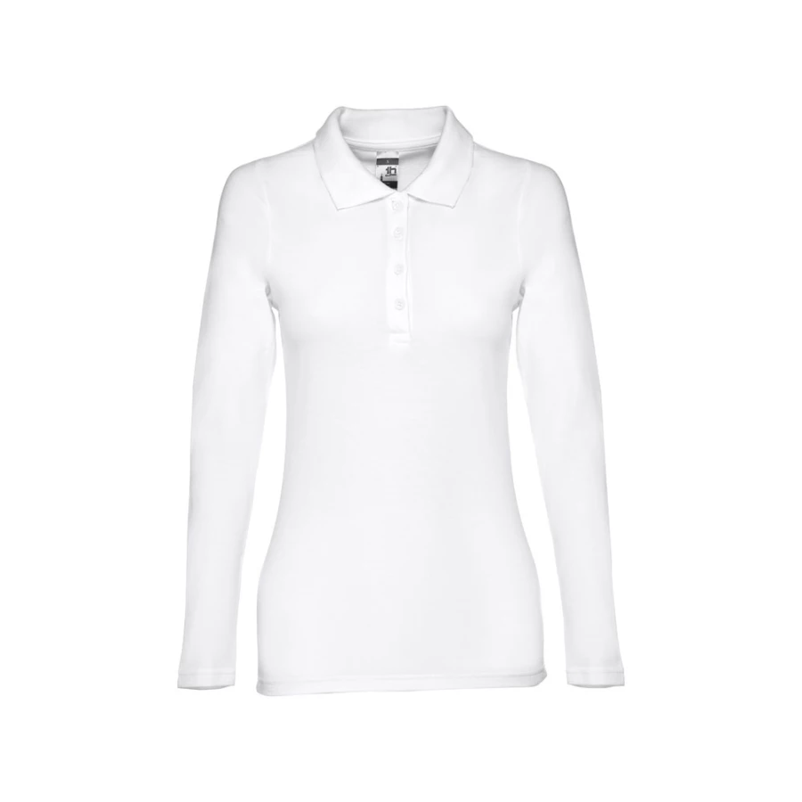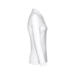 Damski t-shirt polo z długim rękawem ze 100% bawełny o splocie piqué (210 g/m²) ze zgrzebną przędzą bawełnianą. Prążkowany kołnierzyk jest wzmocniony taśmą piqué. Posiada 4 dopasowane kolorystycznie guziki (dodatkowy guzik umieszczony w szwie wewnętrznym). Zszywany po bokach, z podwójnym ściegiem na rękawach. Zdejmowana widoczna etykieta. Rozmiary: S, M, L, XL, XXL