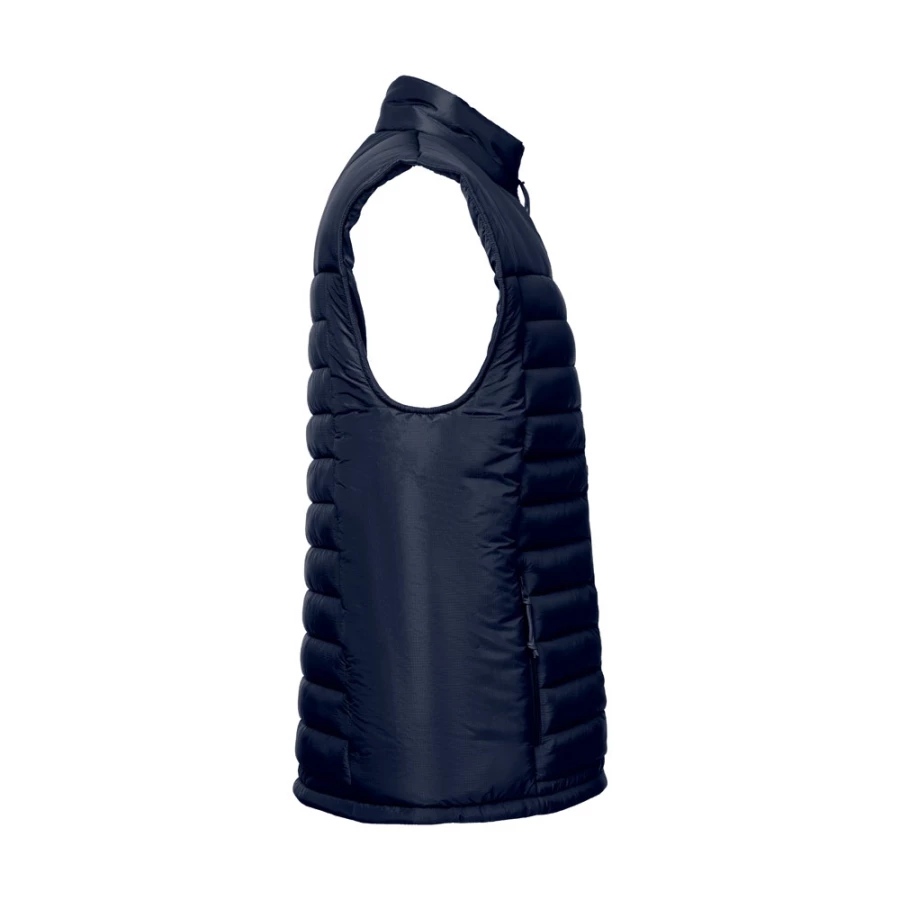 Watowana kamizelka (unisex) wykonana w 100% z nylonu ripstop z recyklingu (350 g/m²), wnętrze jest wyłożone w 100% nylonową taftą z recyklingu (350 g/m²) dla większego komfortu podczas noszenia. Przednie zapięcie na zamek błyskawiczny YKK® - marki, która korzysta z nowoczesnego sprzętu o wysokiej kontroli jakości - i uchwyt. Posiada dwie przednie kieszenie z zamkami błyskawicznymi i ściągaczami oraz dwie wewnętrzne kieszenie z samoprzylepnymi zamkami błyskawicznymi. W dolnej części pleców znajduje się zapinany na zamek dostęp ułatwiający personalizację. Rozmiary: XS, S, M, L, XL, XXL, 3XL