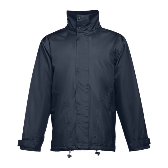 Uniwersalna wyściełana parka (unisex). 100% poliester. Zewnętrzna część: 100% poliester pongee 240 g/m² i wodoodporna powłoka PCV. Wnętrze: 100% poliester z tafty 65 g/m². Wypełnienie: 100% poliester 80 g/m². Obszyty czarnym polarem kołnierz (przylegające zapięcie). Chowany kaptur w kołnierzu, regulowany za pomocą ściągających sznurków z czarnymi stoperami. Przedni otwór z klapą, zamek błyskawiczny (pasujący kolorystycznie), przylegające zapięcie i zatrzaski w kolorze czarnym. 2 zewnętrzne kieszenie z patką i 2 wewnętrzne kieszenie (1 na telefon komórkowy) o przylegającym zamknięciu. Mankiety wewnętrzne z prążkowanej siatki 2x2. Regulowane mankiety zewnętrzne z przylegającym zapięciem. Termo-uszczelnione szwy. Wewnętrzny zamek błyskawiczny. Rozmiary: XS, S, M, L, XL, XXL
