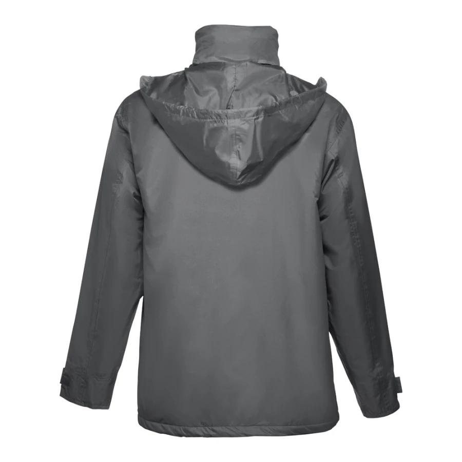 Uniwersalna wyściełana parka (unisex). 100% poliester. Zewnętrzna część: 100% poliester pongee 240 g/m² i wodoodporna powłoka PCV. Wnętrze: 100% poliester z tafty 65 g/m². Wypełnienie: 100% poliester 80 g/m². Obszyty czarnym polarem kołnierz (przylegające zapięcie). Chowany kaptur w kołnierzu, regulowany za pomocą ściągających sznurków z czarnymi stoperami. Przedni otwór z klapą, zamek błyskawiczny (pasujący kolorystycznie), przylegające zapięcie i zatrzaski w kolorze czarnym. 2 zewnętrzne kieszenie z patką i 2 wewnętrzne kieszenie (1 na telefon komórkowy) o przylegającym zamknięciu. Mankiety wewnętrzne z prążkowanej siatki 2x2. Regulowane mankiety zewnętrzne z przylegającym zapięciem. Termo-uszczelnione szwy. Wewnętrzny zamek błyskawiczny. Rozmiary: XS, S, M, L, XL, XXL