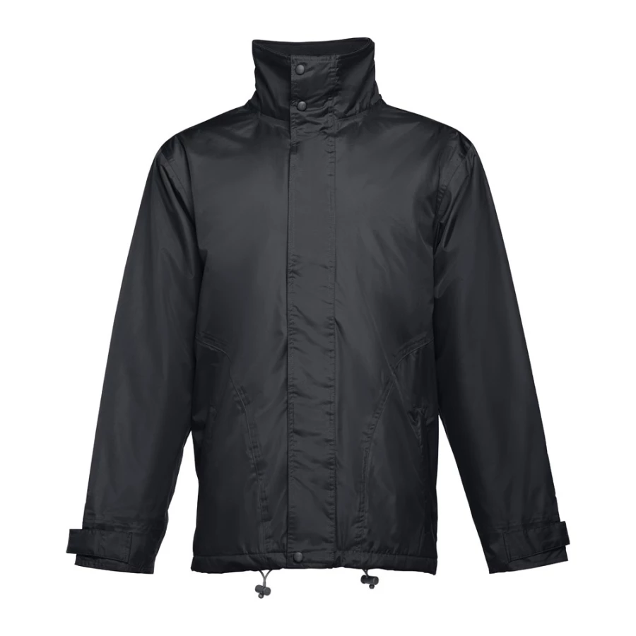 Uniwersalna wyściełana parka (unisex). 100% poliester. Zewnętrzna część: 100% poliester pongee 240 g/m² i wodoodporna powłoka PCV. Wnętrze: 100% poliester z tafty 65 g/m². Wypełnienie: 100% poliester 80 g/m². Obszyty czarnym polarem kołnierz (przylegające zapięcie). Chowany kaptur w kołnierzu, regulowany za pomocą ściągających sznurków z czarnymi stoperami. Przedni otwór z klapą, zamek błyskawiczny (pasujący kolorystycznie), przylegające zapięcie i zatrzaski w kolorze czarnym. 2 zewnętrzne kieszenie z patką i 2 wewnętrzne kieszenie (1 na telefon komórkowy) o przylegającym zamknięciu. Mankiety wewnętrzne z prążkowanej siatki 2x2. Regulowane mankiety zewnętrzne z przylegającym zapięciem. Termo-uszczelnione szwy. Wewnętrzny zamek błyskawiczny. Rozmiary: XS, S, M, L, XL, XXL