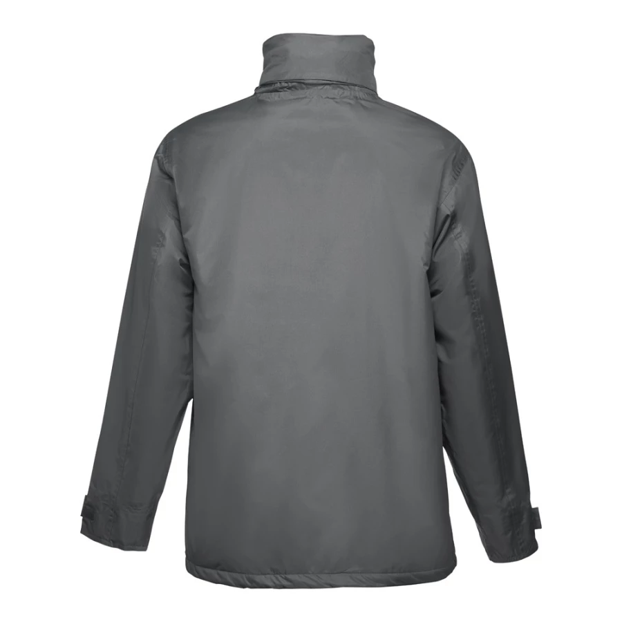 Uniwersalna wyściełana parka (unisex). 100% poliester. Zewnętrzna część: 100% poliester pongee 240 g/m² i wodoodporna powłoka PCV. Wnętrze: 100% poliester z tafty 65 g/m². Wypełnienie: 100% poliester 80 g/m². Obszyty czarnym polarem kołnierz (przylegające zapięcie). Chowany kaptur w kołnierzu, regulowany za pomocą ściągających sznurków z czarnymi stoperami. Przedni otwór z klapą, zamek błyskawiczny (pasujący kolorystycznie), przylegające zapięcie i zatrzaski w kolorze czarnym. 2 zewnętrzne kieszenie z patką i 2 wewnętrzne kieszenie (1 na telefon komórkowy) o przylegającym zamknięciu. Mankiety wewnętrzne z prążkowanej siatki 2x2. Regulowane mankiety zewnętrzne z przylegającym zapięciem. Termo-uszczelnione szwy. Wewnętrzny zamek błyskawiczny. Rozmiary: XS, S, M, L, XL, XXL