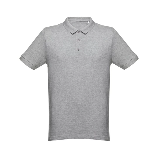 Męska koszulka polo z krótkim rękawem wykonana w 100% z bawełny zgrzebnej (240 g/m²) (kolor: 183: 85% bawełny/15% wiskozy). Regularny krój z kołnierzem i tasiemkowymi rękawami oraz wzmocnieniem kołnierza typu pique. Wzmocniony kołnierz z 3 dopasowanymi kolorystycznie guzikami (dodatkowy guzik umieszczony w szwie wewnętrznym). Zszywana po bokach, z małymi rozcięciami w szwach bocznych u dołu. Zdejmowana widoczna etykieta. Rozmiary: S, M, L, XL, XXL