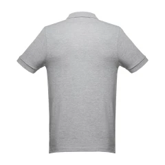 Męska koszulka polo z krótkim rękawem wykonana w 100% z bawełny zgrzebnej (240 g/m²) (kolor: 183: 85% bawełny/15% wiskozy). Regularny krój z kołnierzem i tasiemkowymi rękawami oraz wzmocnieniem kołnierza typu pique. Wzmocniony kołnierz z 3 dopasowanymi kolorystycznie guzikami (dodatkowy guzik umieszczony w szwie wewnętrznym). Zszywana po bokach, z małymi rozcięciami w szwach bocznych u dołu. Zdejmowana widoczna etykieta. Rozmiary: S, M, L, XL, XXL