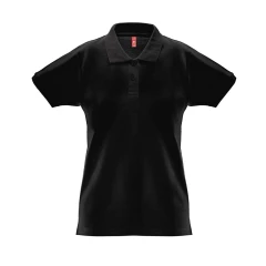 Damska koszulka polo ze 100% zgrzebnej bawełny (240 g/m²) z krótkim rękawem. Krój regular z kołnierzem i wstążkami na rękawach oraz wzmocnieniem kołnierza z piki. Wzmocniony kołnierzyk zapinany na 2 guziki w tym samym kolorze (dodatkowy guzik w szwie wewnętrznym). Zszybana po bokach, z małymi bocznymi otworami na dole. Widoczna etykieta jest możliwa do usunięcia. Rozmiary: S, M, L, XL, XXL