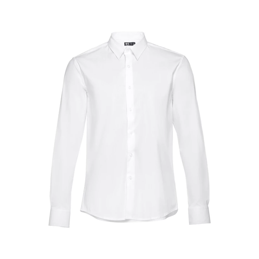 Męska koszula z długim rękawem. 68% bawełna, 28% poliamid i 4% elastan (115 g/m²). Długi rękaw z 1 zakładką i regulowanymi mankietami z 2 guzikami. Zapinana na 7 guzików w dopasowanym kolorze. Rozmiary: S, M, L, XL, XXL